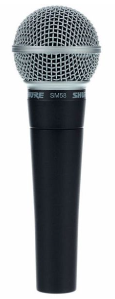 Micro filaire SHURE SM58. Idéal pour discours, chants, etc... -Sans interrupteur marche/arrêt -Directivité Cardioïde -Réponse en fréquence: 50 - 15.000 Hz -Dimensions: 23 x 162 x 51 mm -Poids: 298 g